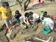 戸外で水、砂、土などの変化する素材に触れ、道具を使い、友だちと遊ぶことで感覚(五感)を育てます。