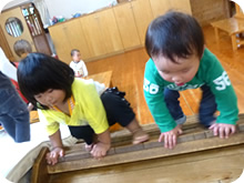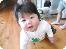 寝返りができる頃からおむつを取り、動きやすくし、広い部屋で腕を床につけ体を支え、這い這いを沢山することで体幹や足指、腰、腕の力をつけます。