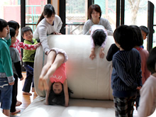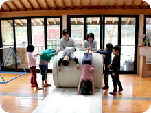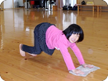朝、登園すると、必ずマット運動をします。マットの上で背骨の運動や足指を使い、体を回転することで、血の循環をよくし、脳の活性化を図ってから活動に移ります。
