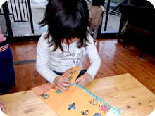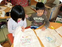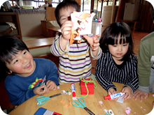 はさみを使い折り紙、粘土遊びなど指先を使う遊びは、2歳児頃から始まり、年長になると、三つ編みで縄跳びの縄を編んだり、雑巾や道具袋を縫ったり、針仕事も年間通じて行います。