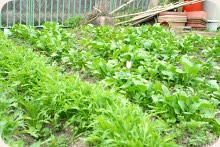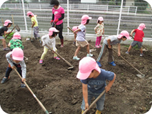 朝のおやつに野菜と牛乳、給食にも野菜を多く使い、栄養バランスに心がけています。また、菜園で無農薬野菜を子どもたちと作っています。