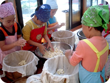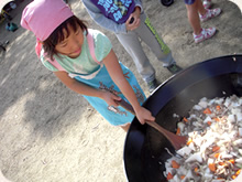 採れた野菜を使ってクッキング保育を行っています。また、食べ物と体の関係などの栄養指導を年間通して行っています。